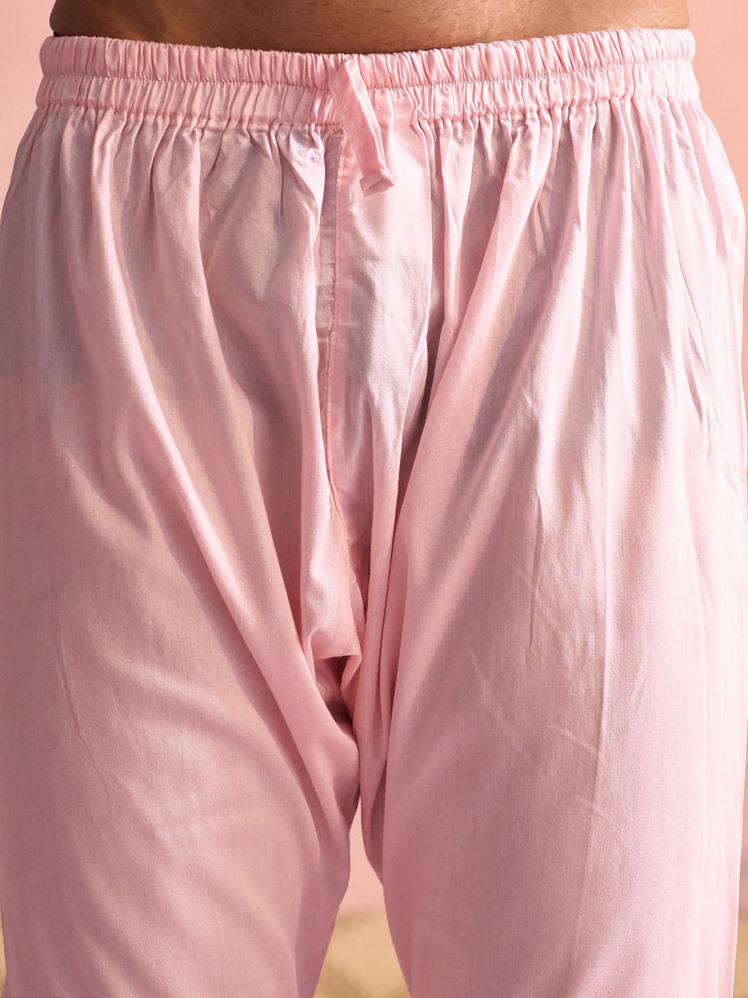 This Sherwani in georgette fabric is a visual masterpiece. Rich and luxurious fabric is enhanced with motif embroidery further adding a resplendent look. The style is detailed with a mandarin collar and a placket with buttons to bring attention to the intricate embroidery on the borders and the sleeves with pink viscose solid kurta has mandarin collar, full sleeves with pockets and pyjama set.