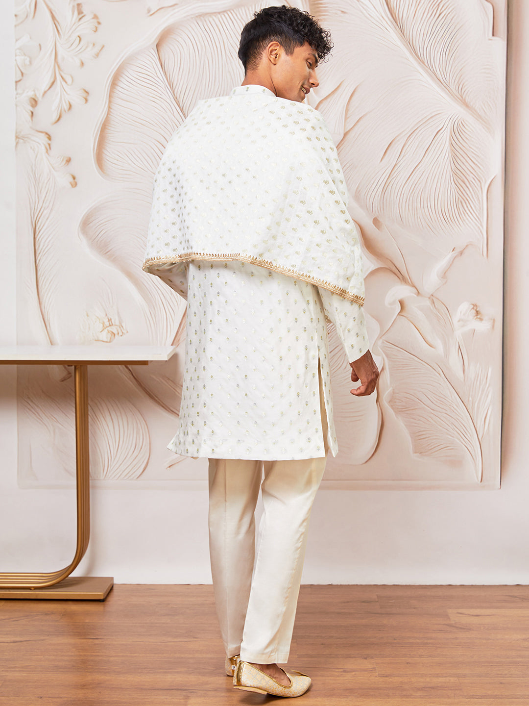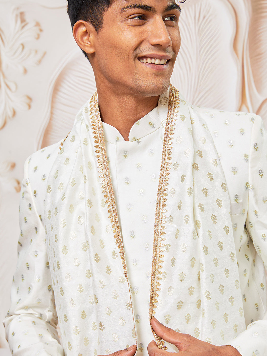 This men's sherwani, pant, and dupatta set is a sophisticated and regal ensemble, perfect for weddings and grand celebrations. The sherwani features a with intricate gold jacquard motifs, exuding elegance and royal charm. The structured silhouette enhances the wearer's posture, while the mandarin collar and front button detailing add a refined touch.Paired with tailored cream-colored pants, the outfit maintains a balanced and polished look. The matching jacquard dupatta, adorned with a delicate gold border, drapes gracefully to complete the ensemble. Styled with traditional embroidered juttis, this set is ideal for grooms, groomsmen, or anyone looking to make a striking impression at special occasions.