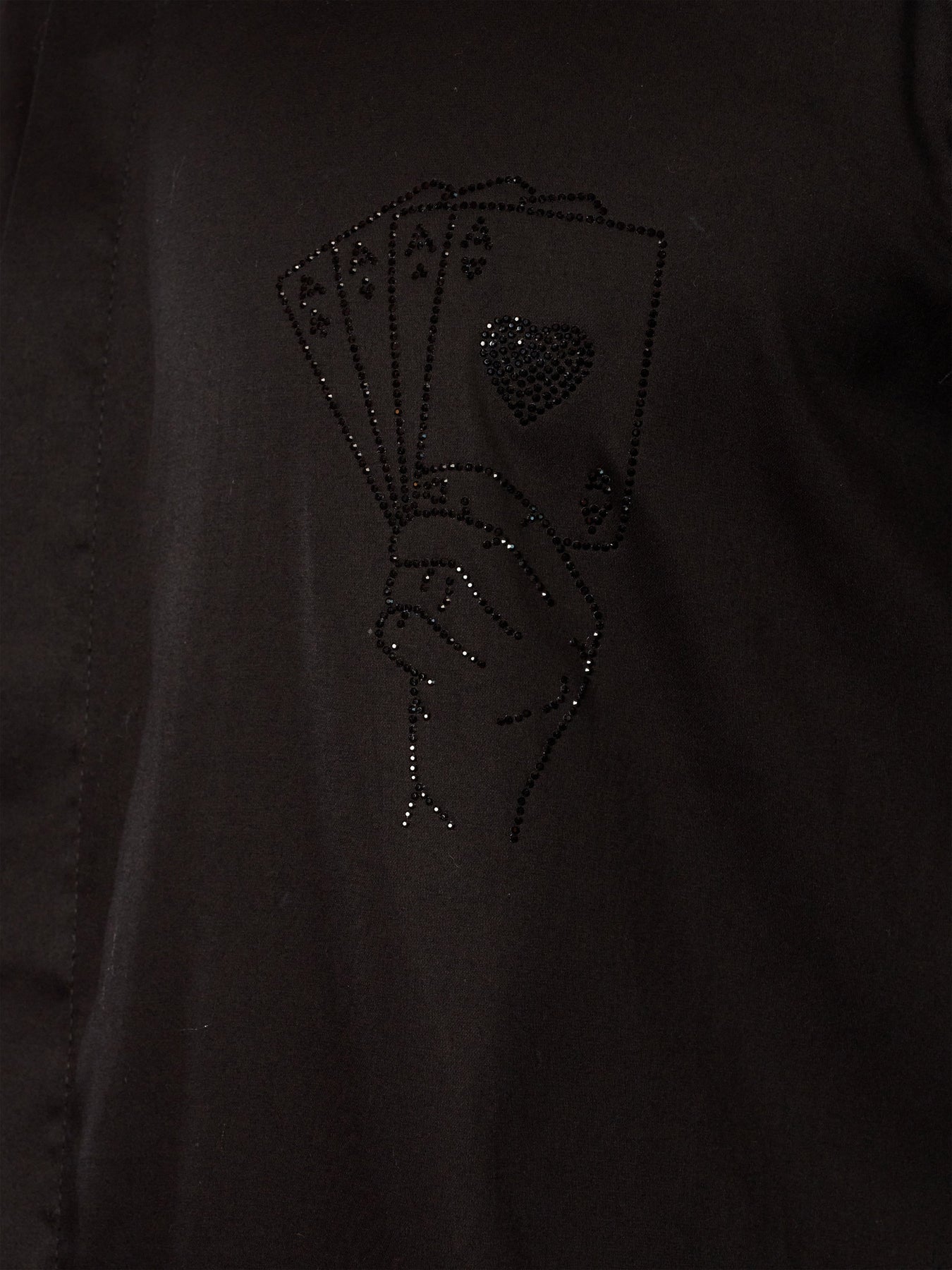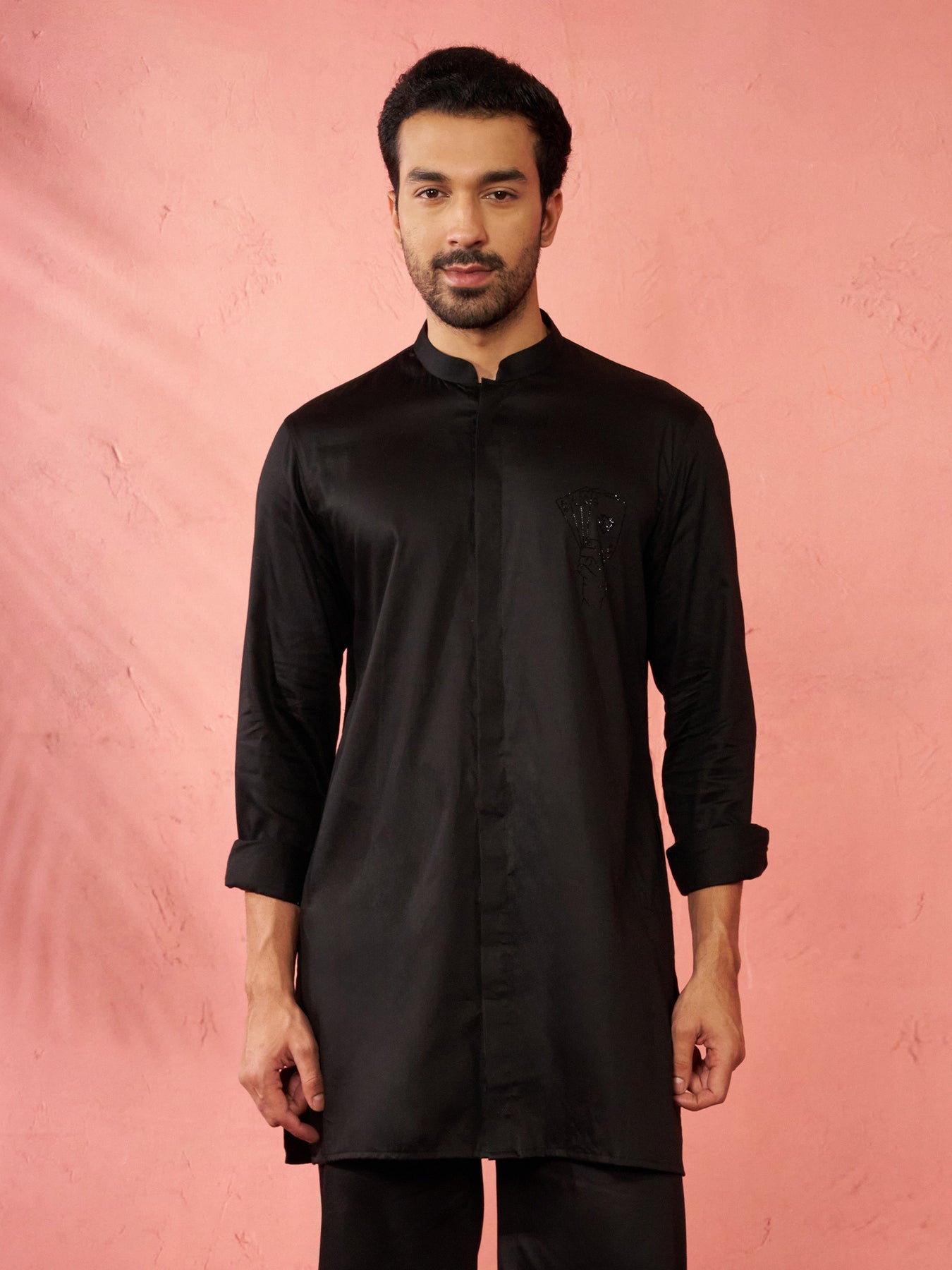 Make a style statement with Vastramay's black mid-length kurta in premium fine satin fabric. Features unique stone work embroidery on right chest with cuffed sleeves for contemporary ethnic styling.
