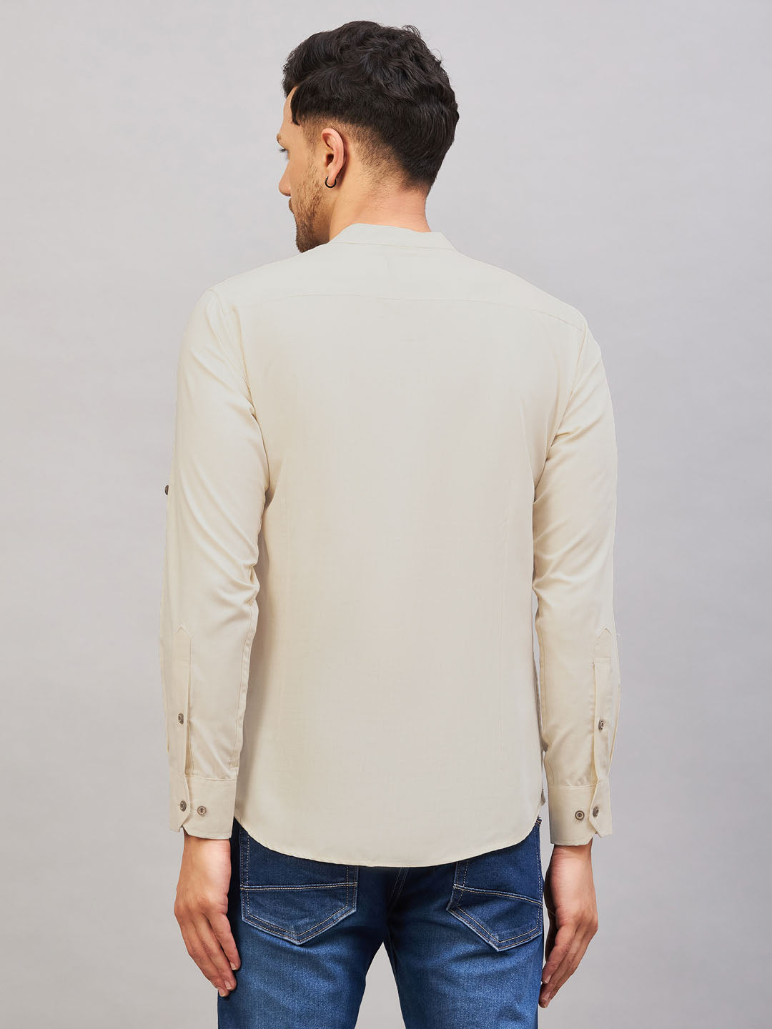 Light Green color solid short kurta, has a mandarin collar, long sleeves, curved hem, button placket.
