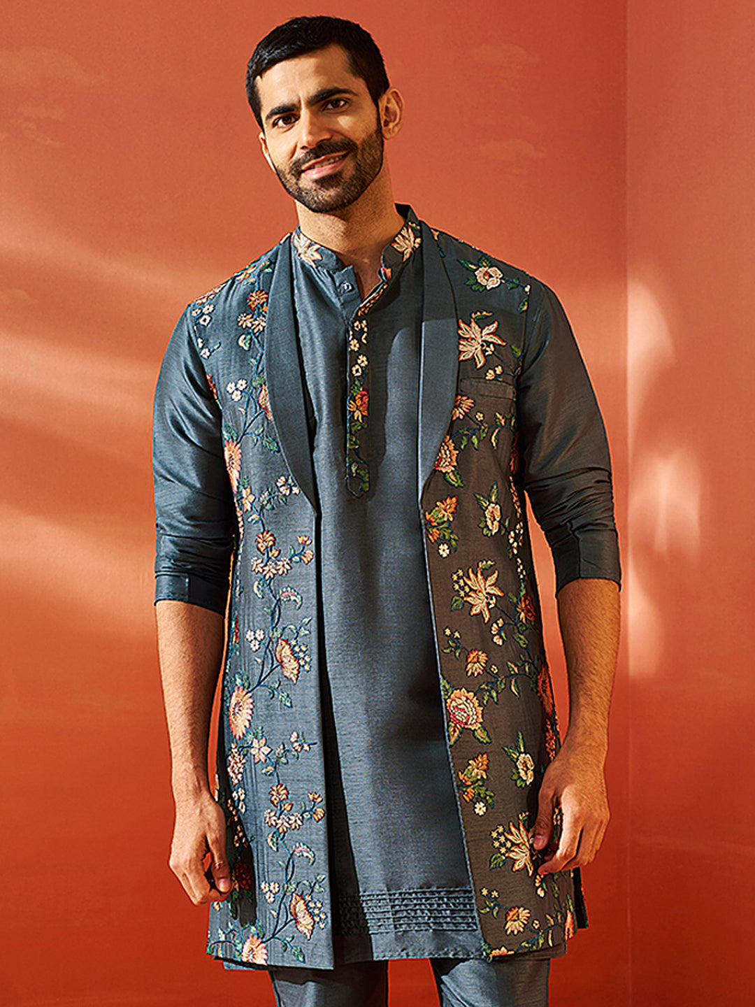 This Silk Blend Embroidered Long Nehru Jacket features a shawl collar, sleeveless design, and front-open style with a welt pocket. Embellished with blossom motifs, it offers bold style and a modern flair, perfect for weddings, parties, and festive occasions.