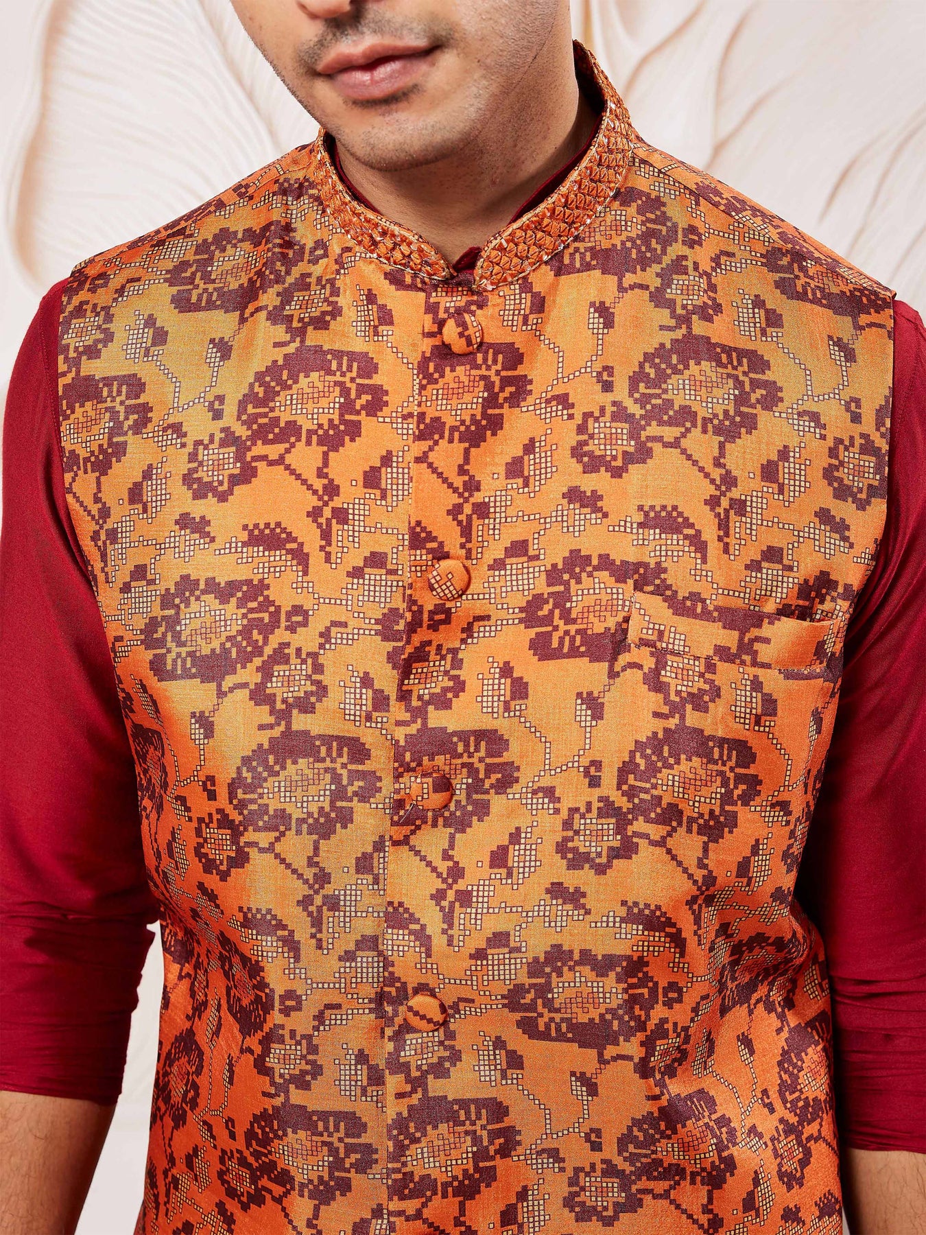 Silk Blend Allover printed Nehru jacket, has a embroidered mirror work mandarin collar, sleeveless,button closure Wear it in parties,traditional functions and festive occasion.
