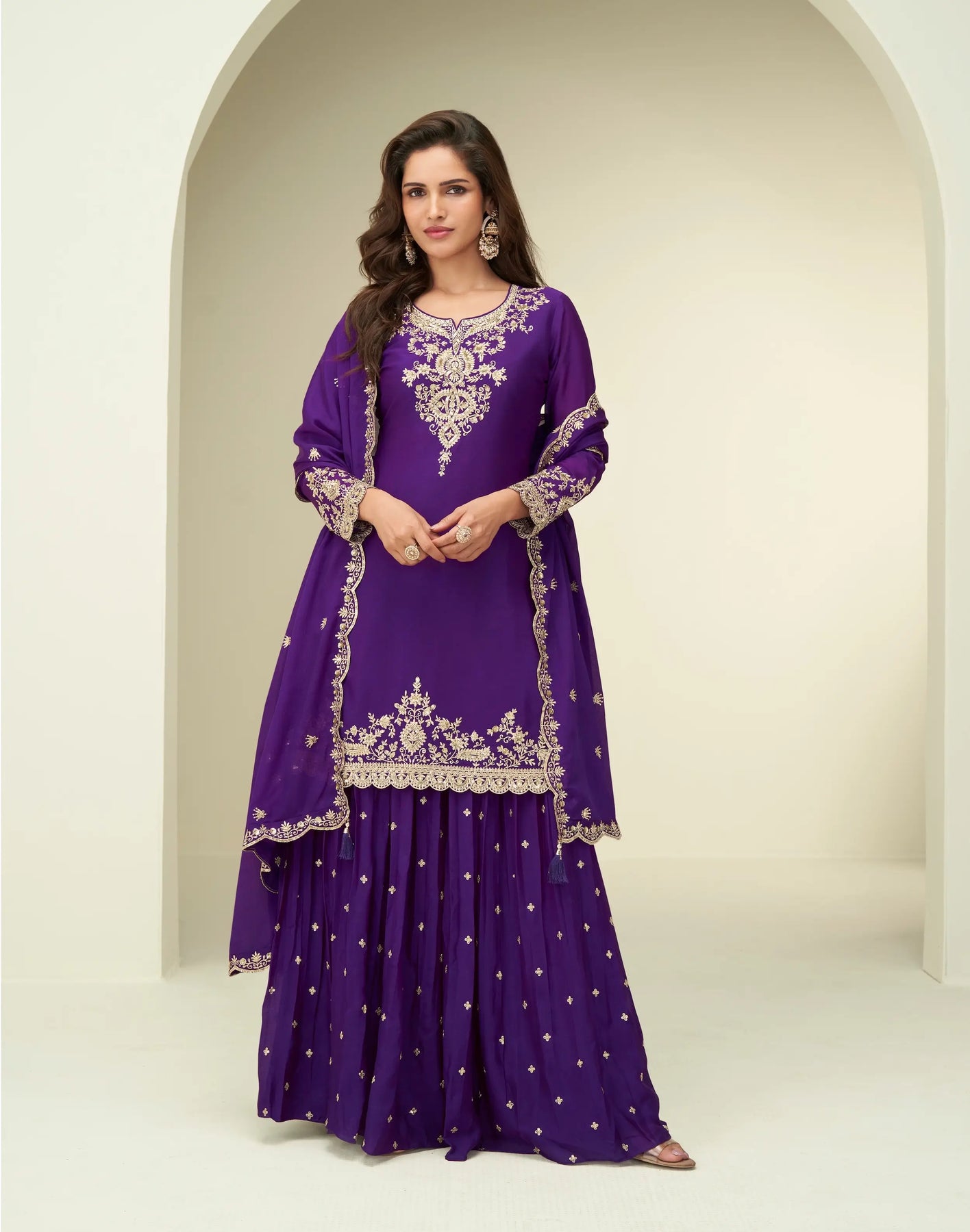 Elevate your festive look with this purple chinon silk palazzo set, gracefully adorned with thread and sequins embroidery work. The matching palazzo and dupatta, creating a chic yet traditional ensemble perfect for weddings, parties, and festive occasions.
