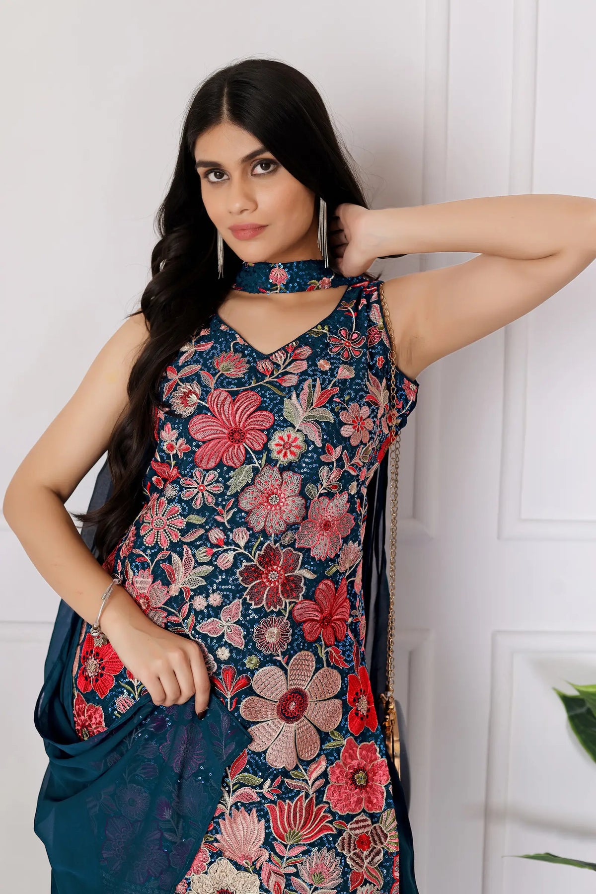 Teal Blue Georgette Palazzo Salwar Suit With Sequence Embroidery Work