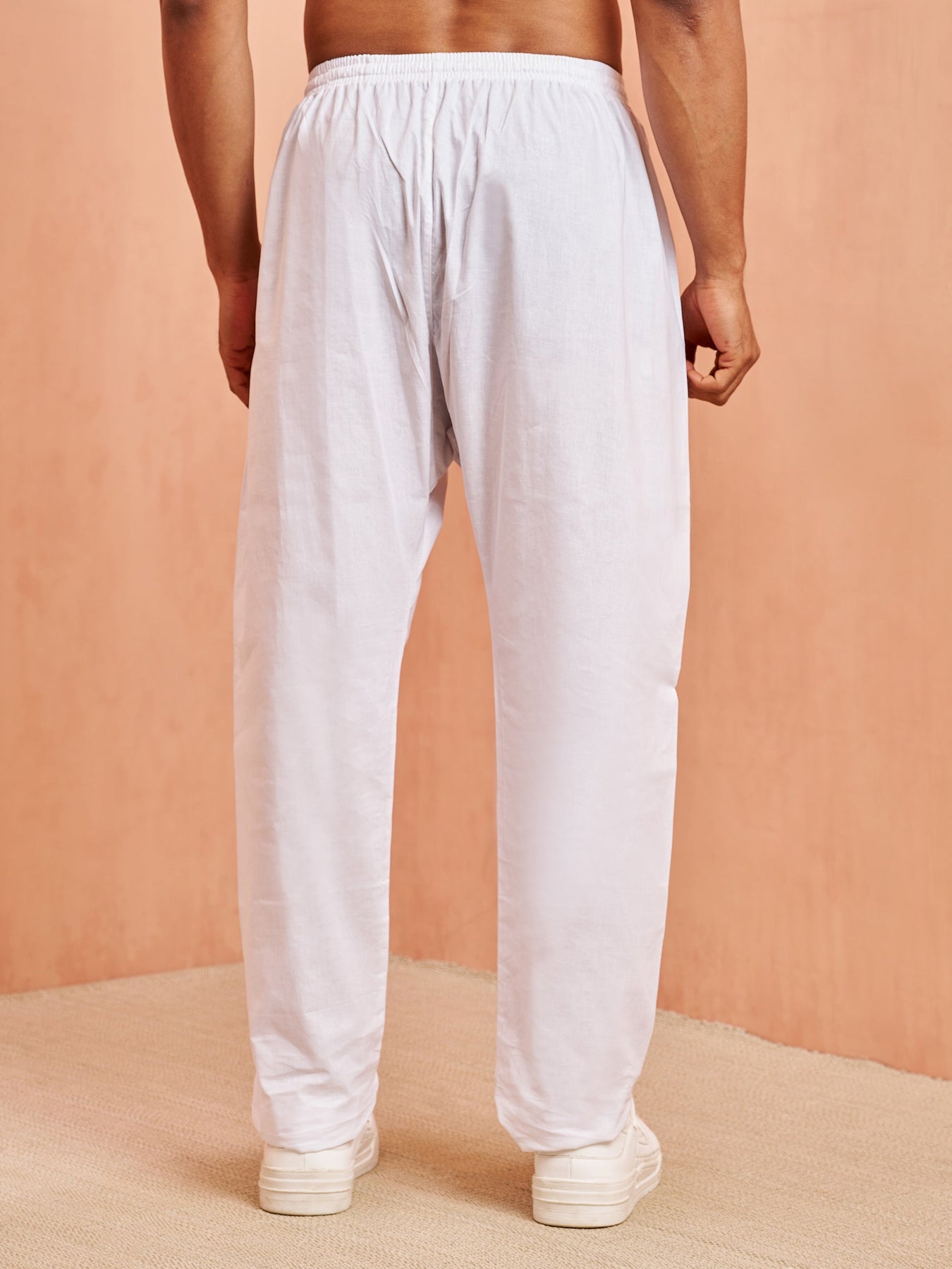 Premium quality cotton pyjama in classic white color featuring solid pattern design. Comfortable drawstring and elasticated waist ensures perfect fit. Ideal for festive occasions like Diwali, Durga Puja, EID, weddings, and casual summer wear. New Style Aligarh design combines traditional aesthetics with modern comfort.