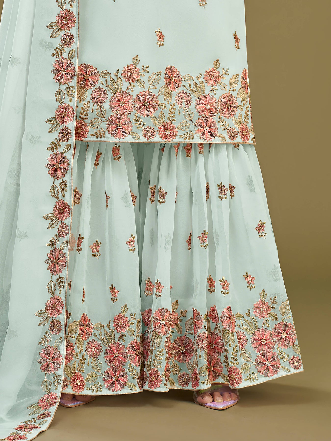- Introducing our exquisite firozi embroidered georgette function wear sharara suits! a perfect choice for any special occasion or festive event. This beautiful ensemble is crafted from high-quality georgette material and adorned with exquisite multi-thread embroidered work and sequin embellishments. With its alluring design and attention to detail, this sharara suit is sure to make a statement wherever you go.