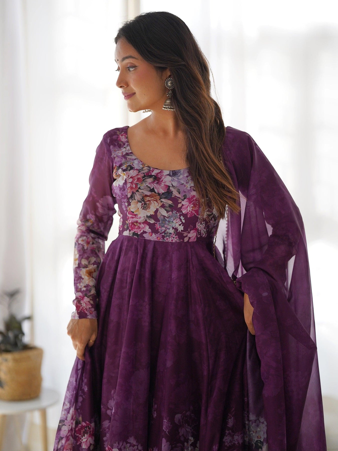 • Step into sophistication with this exquisite purple organza Anarkali suit, designed to captivate with its intricate floral print work and luxurious fabric. The suit's 2.3-meter flair creates a stunning, flowing silhouette that moves gracefully with you, making it a perfect choice for festivals, functions, and special events.