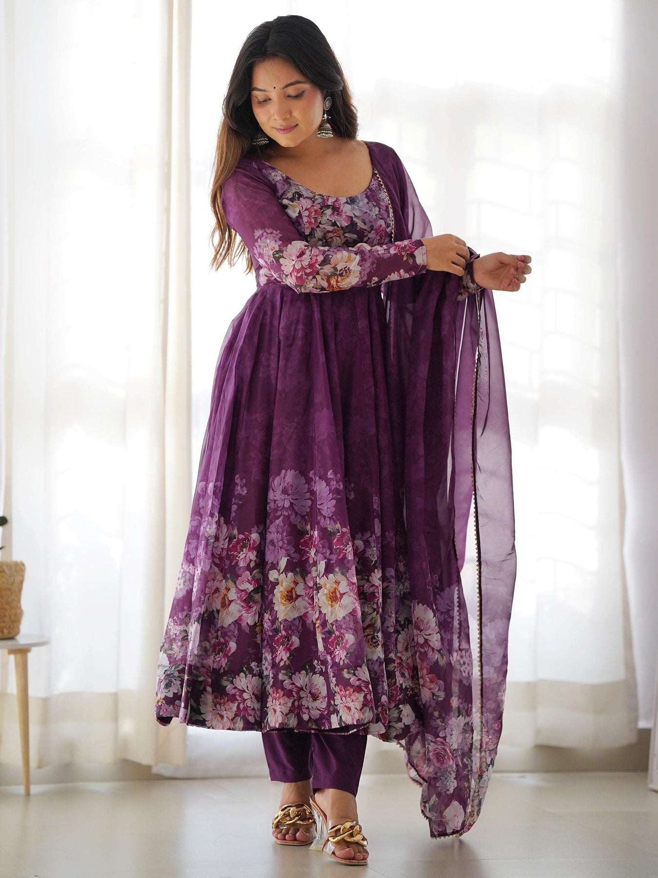 Beautiful purple organza Anarkali suit with floral print for special occasions