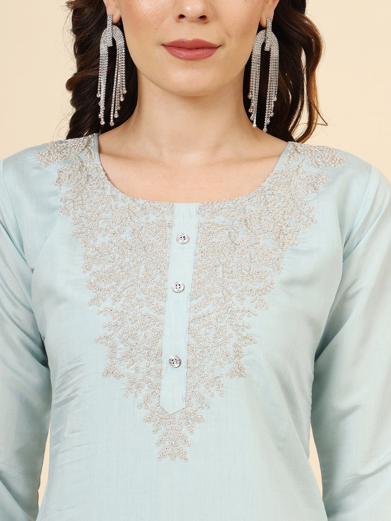 Beautiful Sky-Blue Embroidered Work Silk Traditional Pant Suit