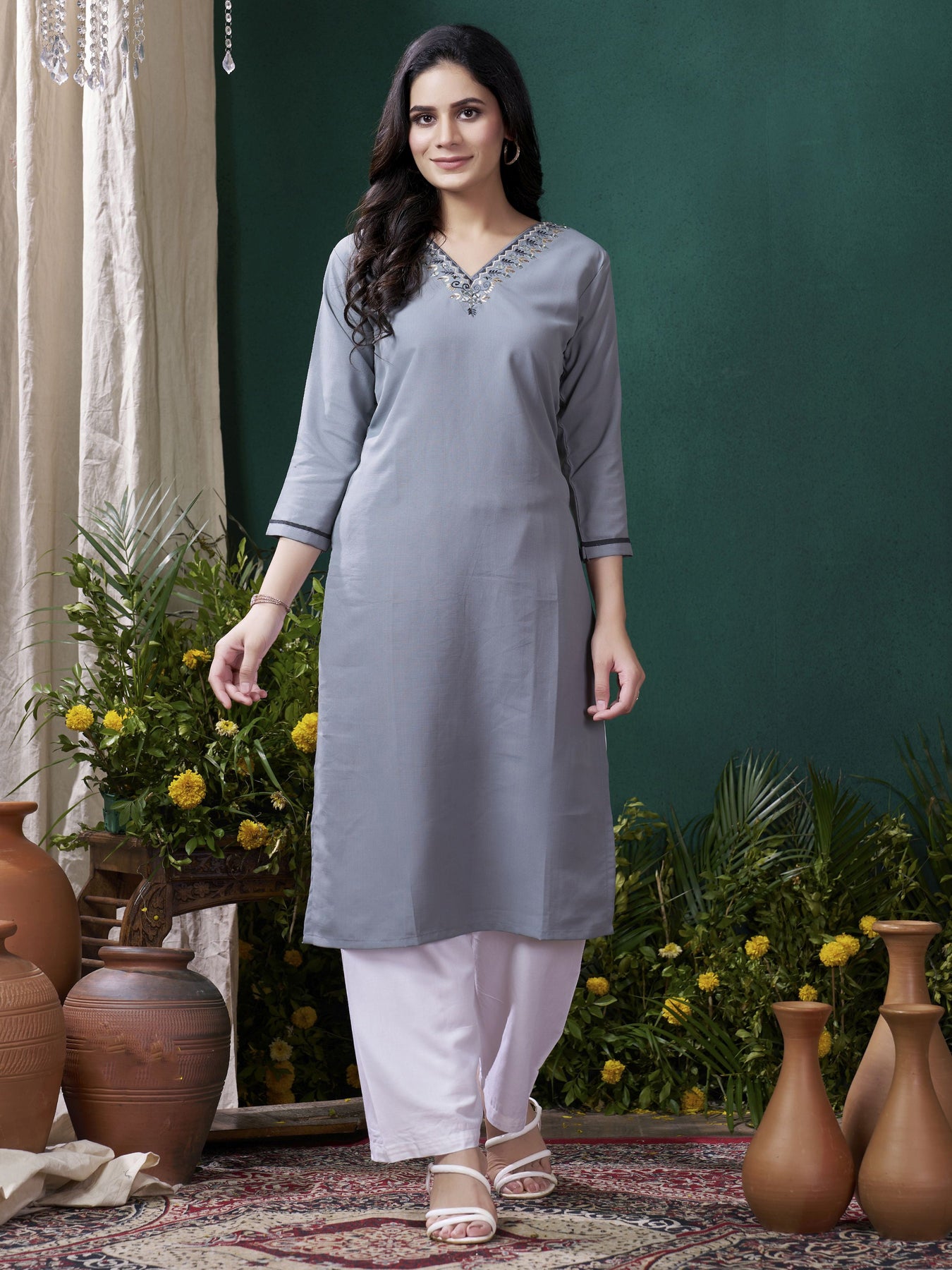 - Make a statement with this elegant grey cotton suit, beautifully embellished with intricate embroidered work that adds sophistication to your ethnic wardrobe.