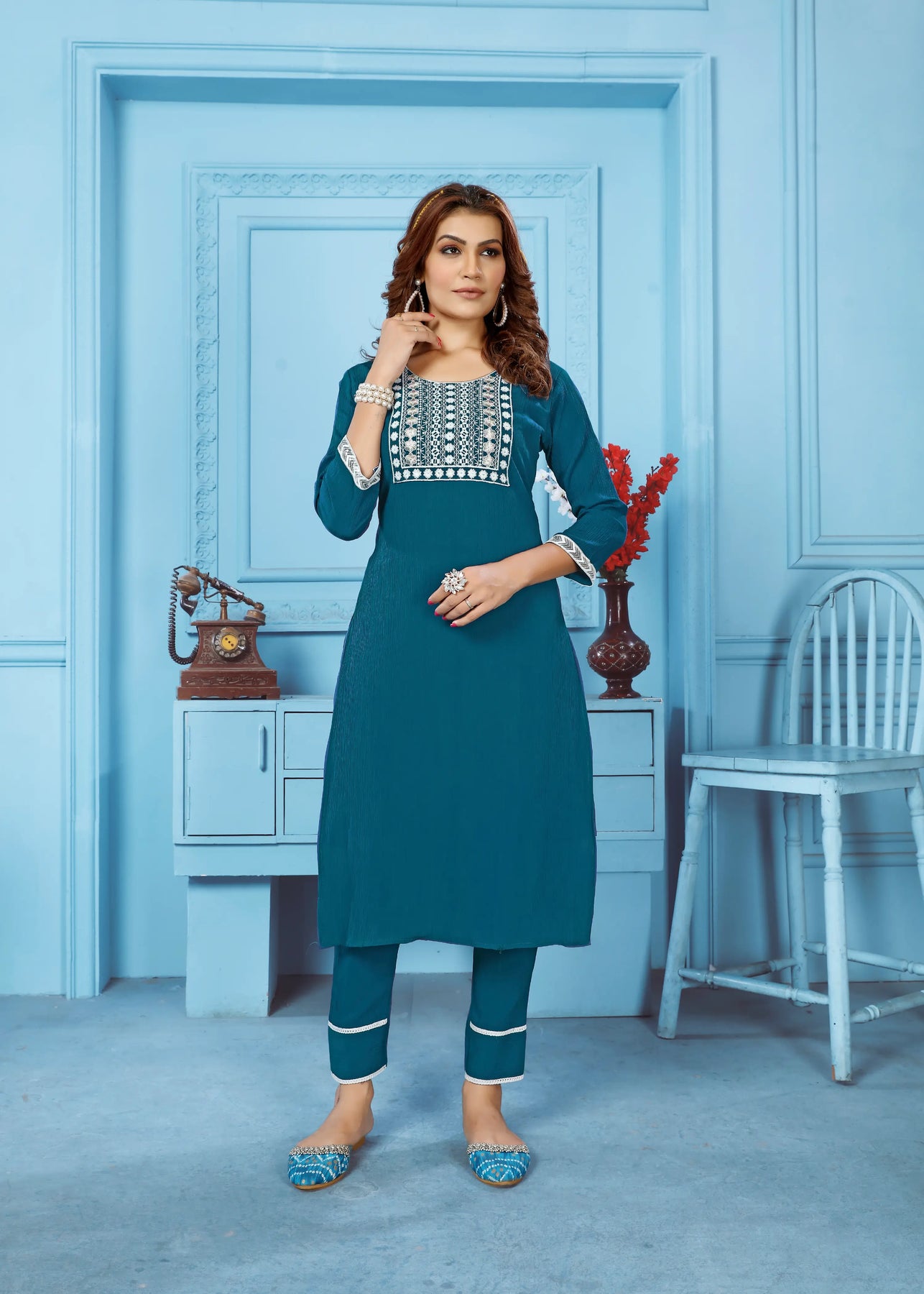 Experience our Cyan Blue Kurta Set featuring a straight-cut kurta with embroidery work, paired with comfortable cotton pant. Perfect for daily wear, it offers both style and ease, making it an ideal choice for various occasions.