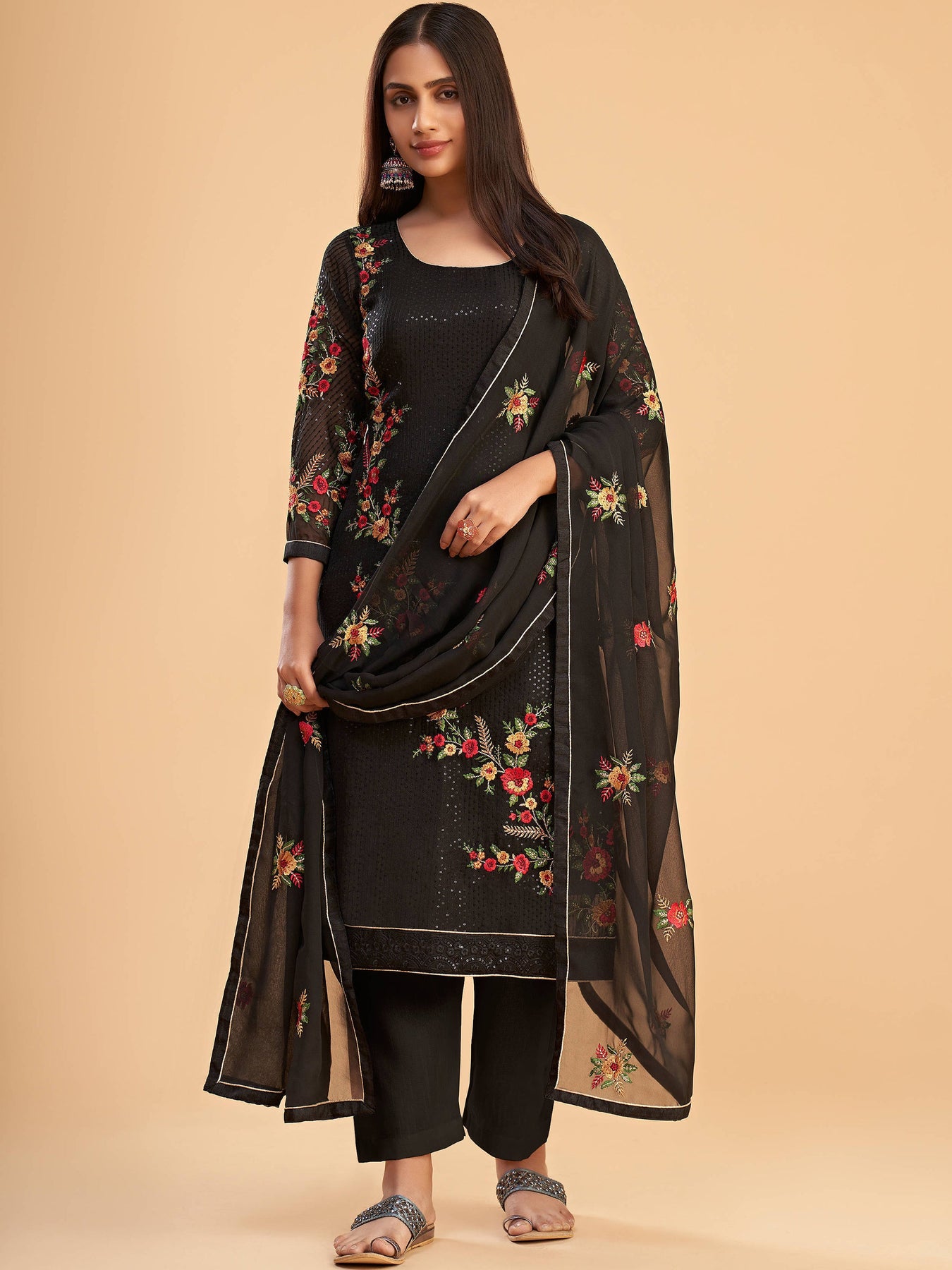 - Attract compliments with this beautiful Black color suit formed with georgette material with sequins, thread, zari embroidery work, and santoon inner material.