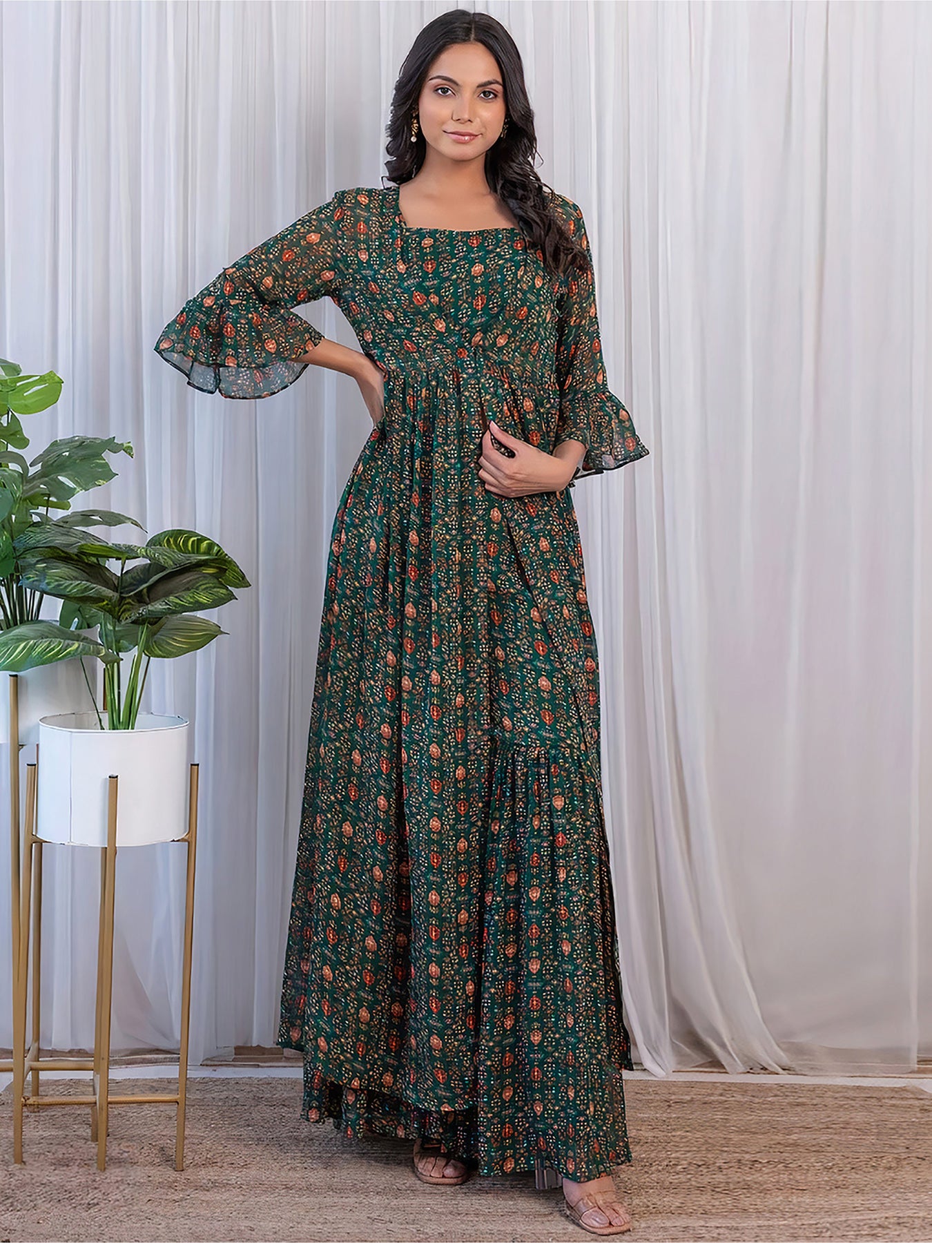 • Introducing our fabulous green digital printed georgette sharara suit with jacket, a stunning outfit that combines elegance and charm. This ready-to-wear sharara suit is perfect for those special occasions, parties, festivals, or weddings where you want to make a stylish statement.