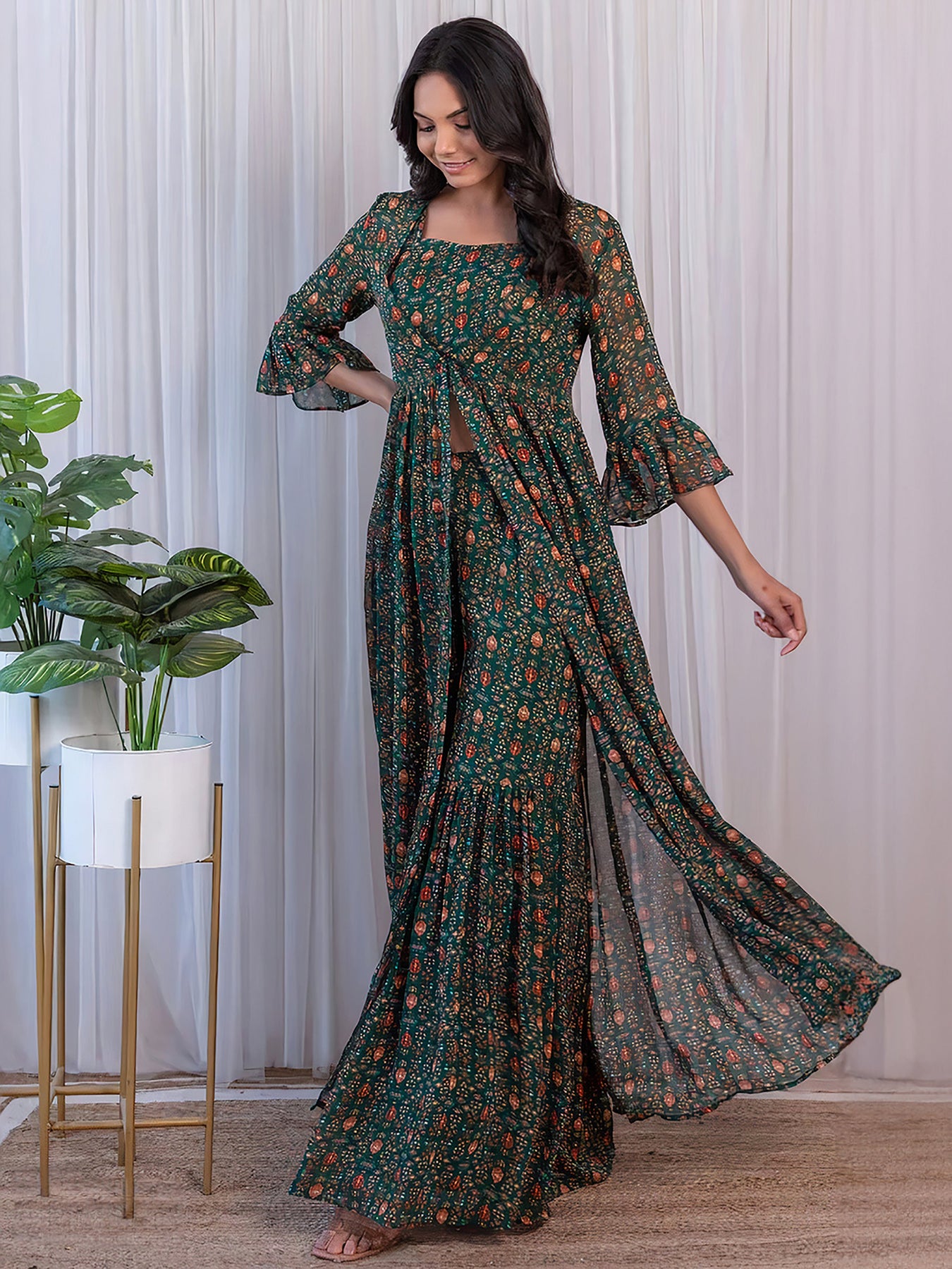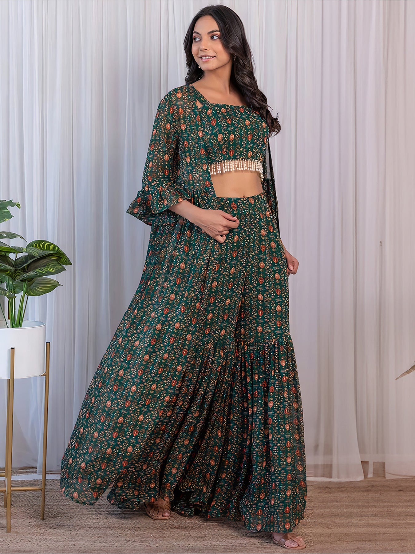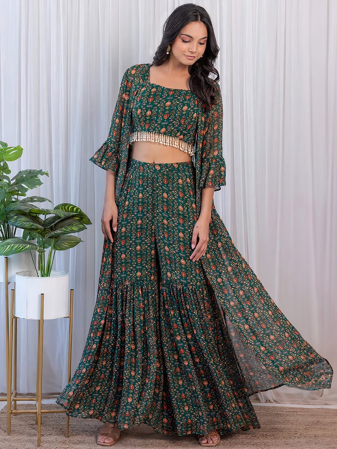 • One of the key benefits of this outfit is its versatility. The crop top and sharara with a jacket are ready to wear and available in sizes XS, S, M, L, XL, and XXL, ensuring a perfect fit for every body type. The bottle green color of the georgette material adds a touch of sophistication and complements any skin tone.
