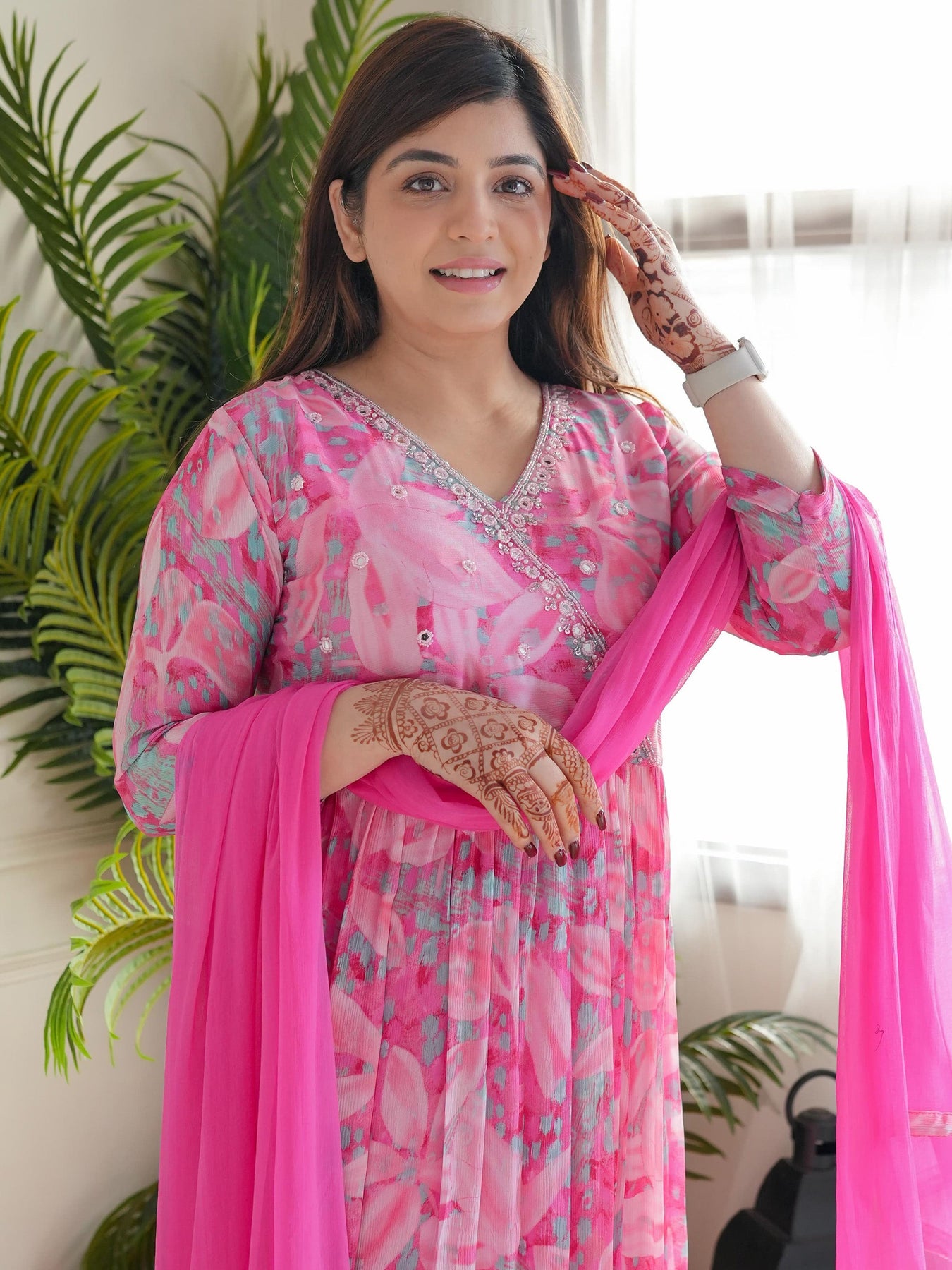 Fabulous Pink Floral Printed Chinon Pant Suit With Dupatta
