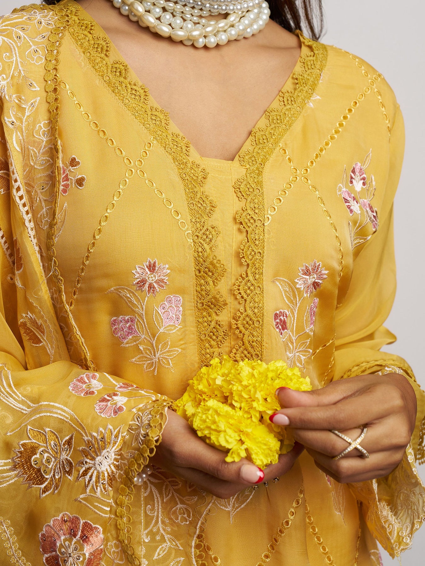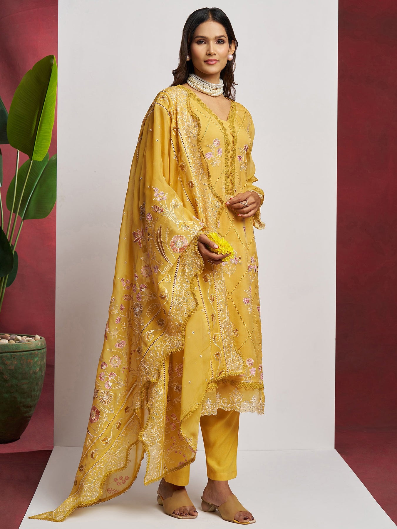 Exquisite yellow organza fabric suit with intricate floral embroidery and sequin work