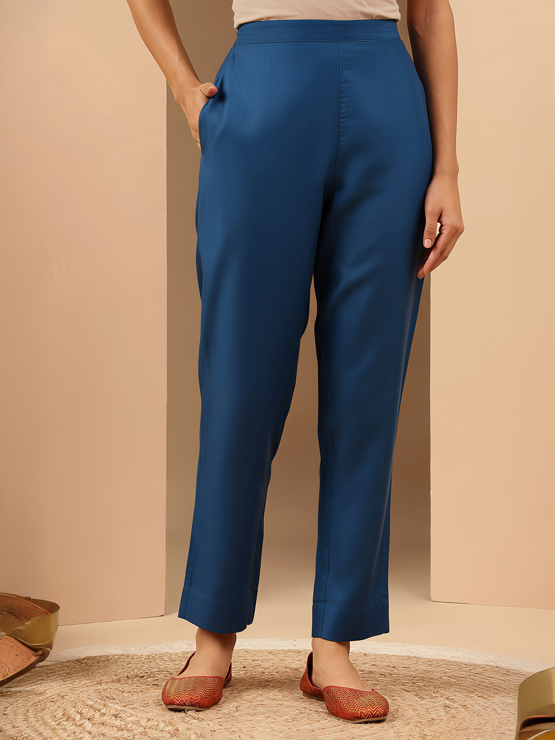 • Elevate your festive wardrobe with this teal silk blend straight kurta set from janasya, designed to bring timeless grace and refined elegance. The kurta features a round neckline adorned with exquisite foil work ethnic motifs on the yoke, sleeves, and hemline, beautifully enhancing its traditional appeal. The shimmering foil detailing on both panels adds a rich festive touch, perfect for special occasions. It is paired with teal solid narrow pants featuring a semi-elasticated waistband, side pocket, and side slit, ensuring both comfort and functionality. Completing the ensemble is a silk blend teal dupatta trimmed with a delicate gota patti lace border. Style it with gold jhumkas and bangles for an effortlessly regal look.
