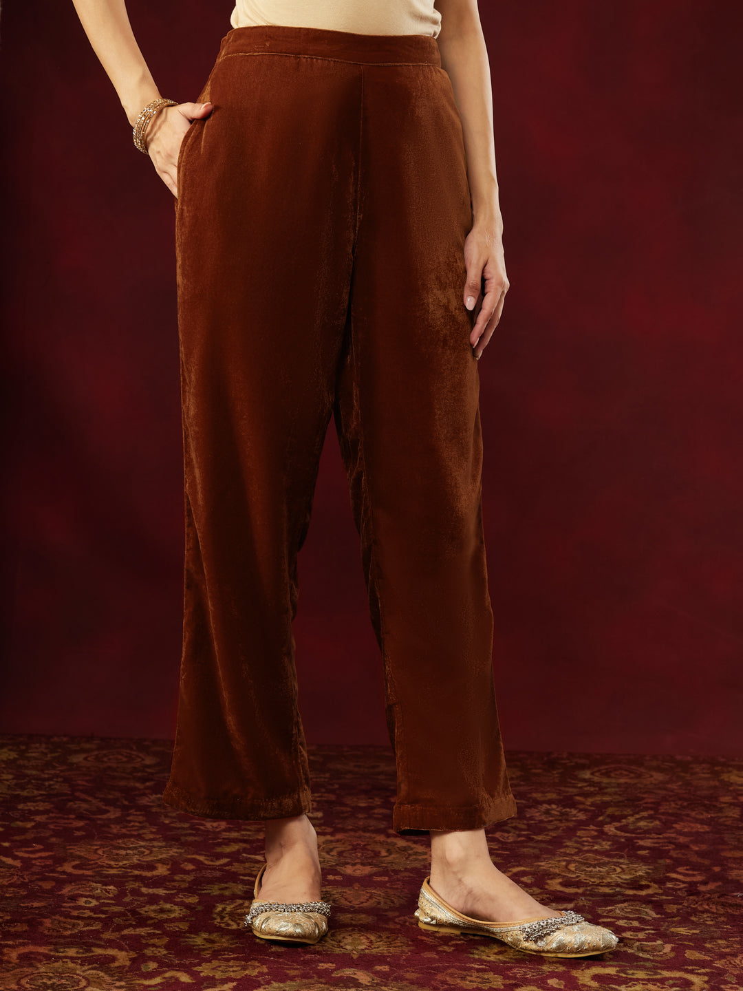 • Infuse the regal charm to your festive wardrobe with this luxurious brown velvet straight kurta set from janasya. Crafted in plush velvet, the kurta features a striking notch neckline adorned with intricate golden lace detailing that extends in layered panels down the yoke, creating an opulent focal point. The full-length sleeves are finished with delicate golden lace at the cuffs, adding to its regal charm. The kurta is paired with matching solid brown straight pants featuring a semi-elasticated waist for comfort and a practical side pocket. The look is completed with a rich brown silk blend dupatta, accentuated with golden lace along the edges for a festive flair. Style it with traditional gold jhumkas, a statement ring, and embellished mojaris to make a graceful impression at weddings and special occasions.