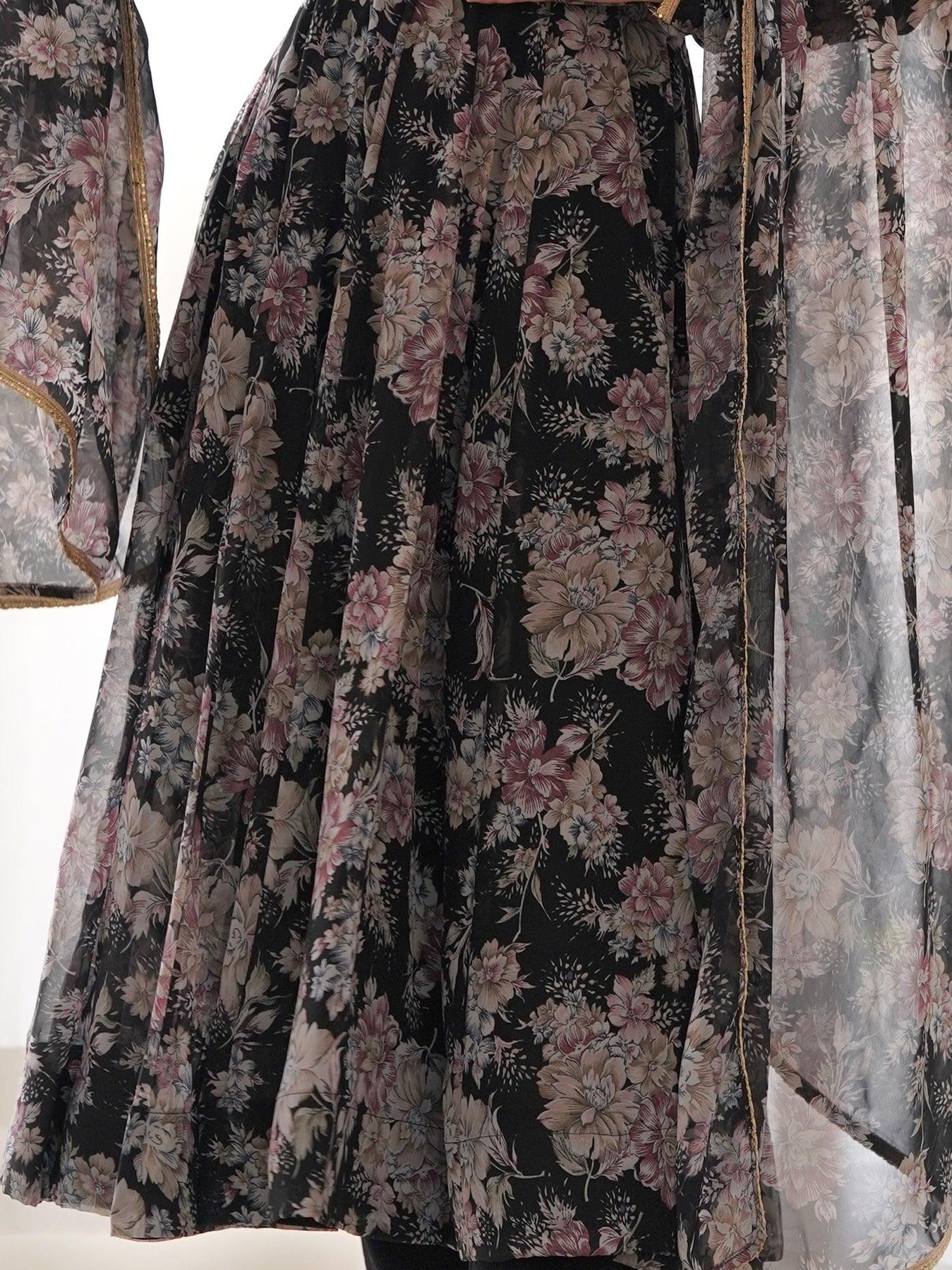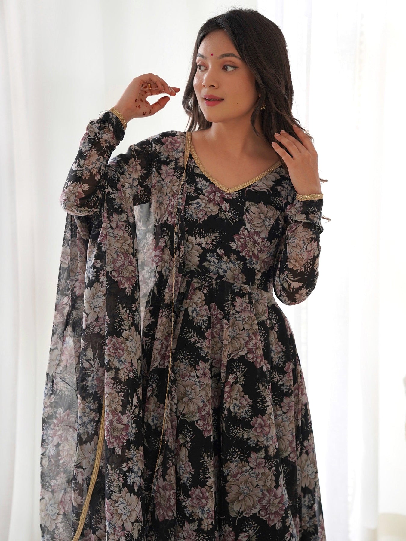 Lovely Black Floral Printed Georgette Anarkali Pant Suit With Dupatta