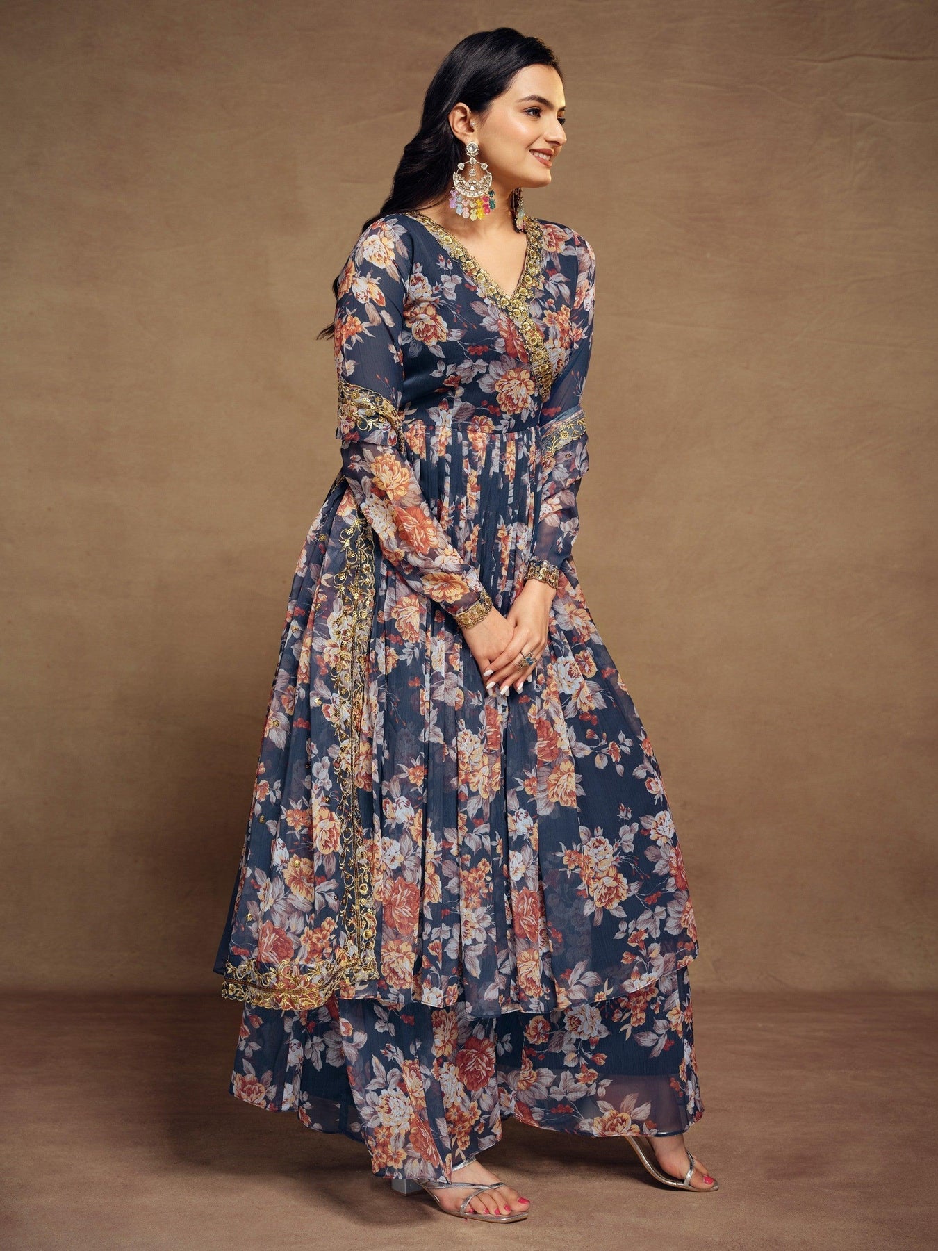 Elevate your style with stunning blue floral printed chiffon palazzo suit