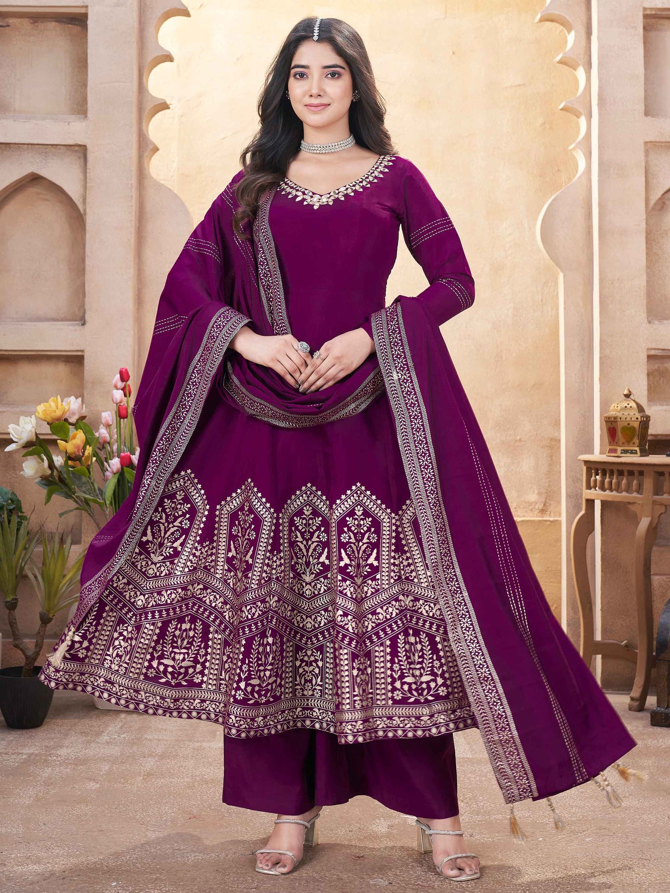 Marvelous Purple Foil Printed Silk Festival Wear Anarkali Suit Palazzo - Elegant and vibrant purple silk Anarkali suit with foil print