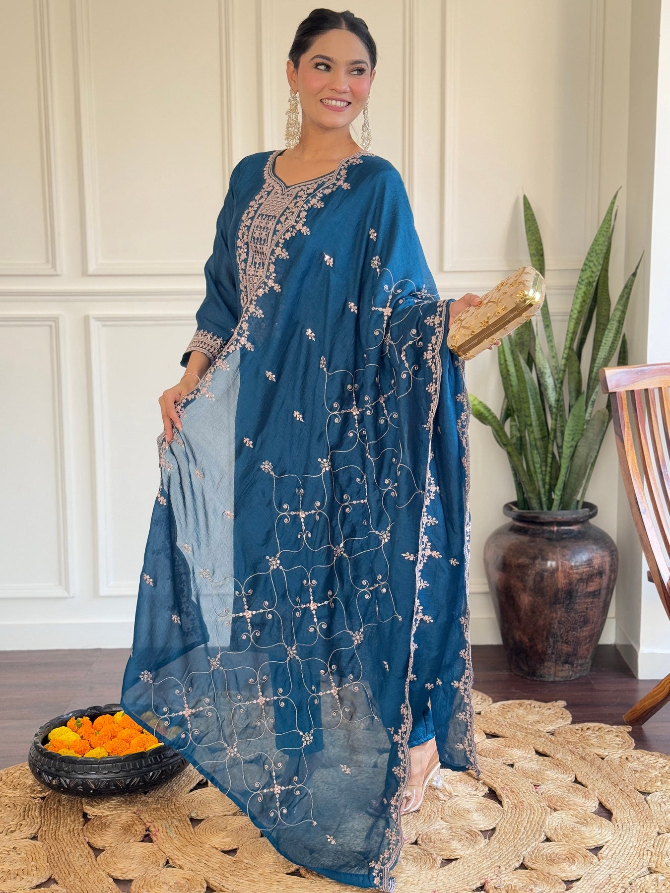 Matching Vichitra silk pant and coordinating dupatta with zari and thread embroidery