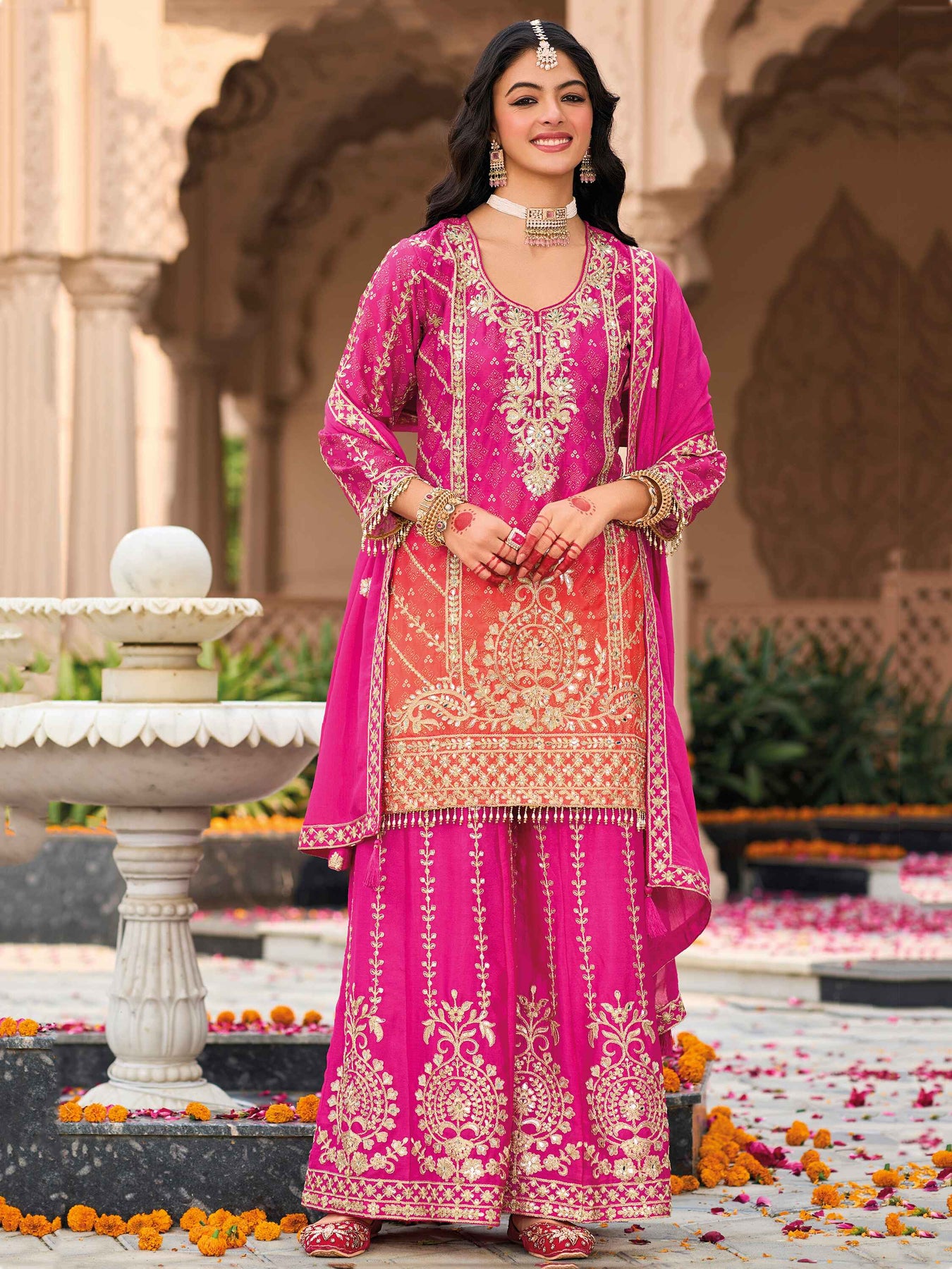 - The matching pink palazzo, crafted from the same heavy chinon and adorned with the same exquisite details, provides unparalleled versatility. Wear them together for a cohesive and elegant statement or style them separately to create diverse and chic outfits.