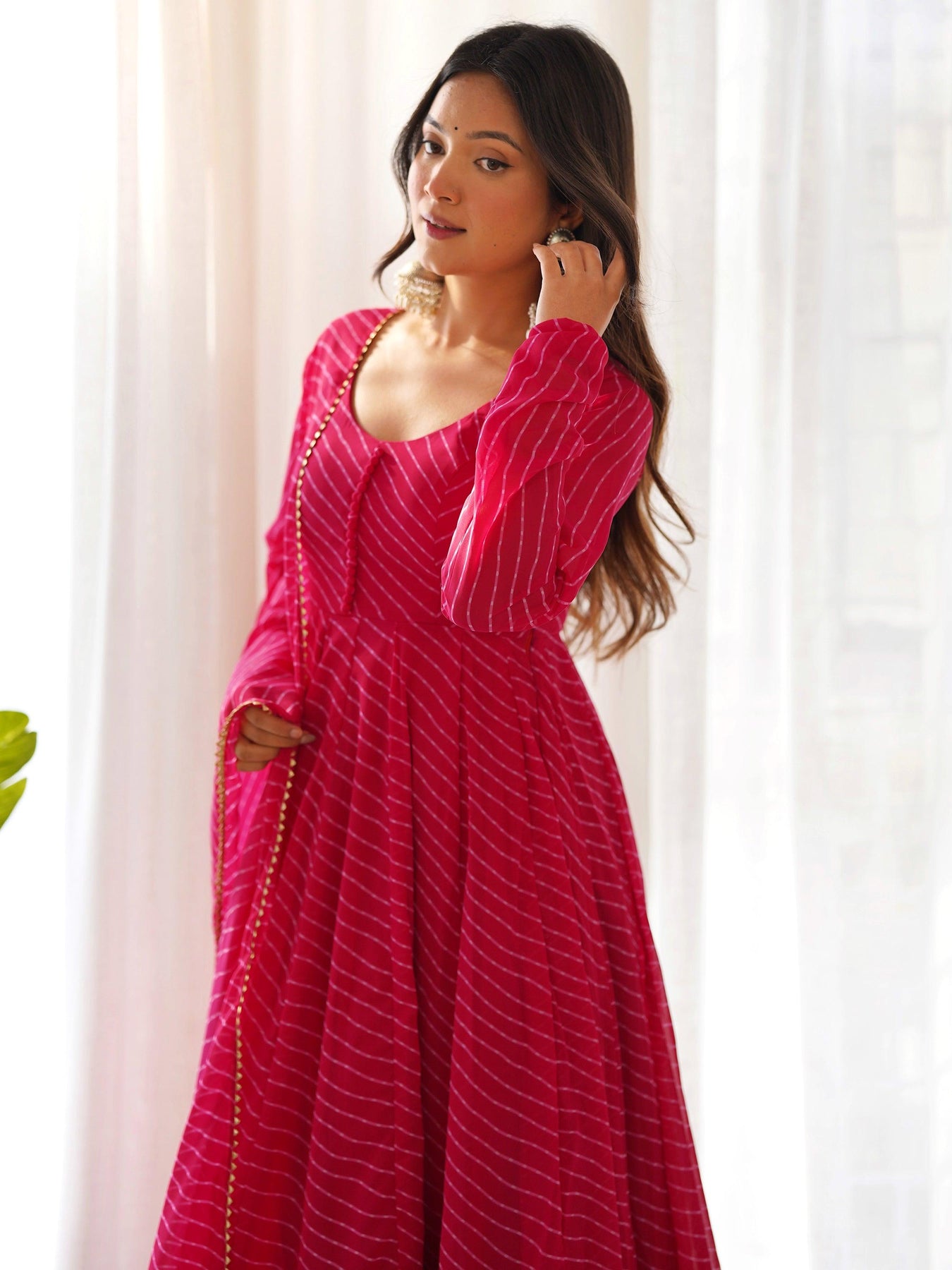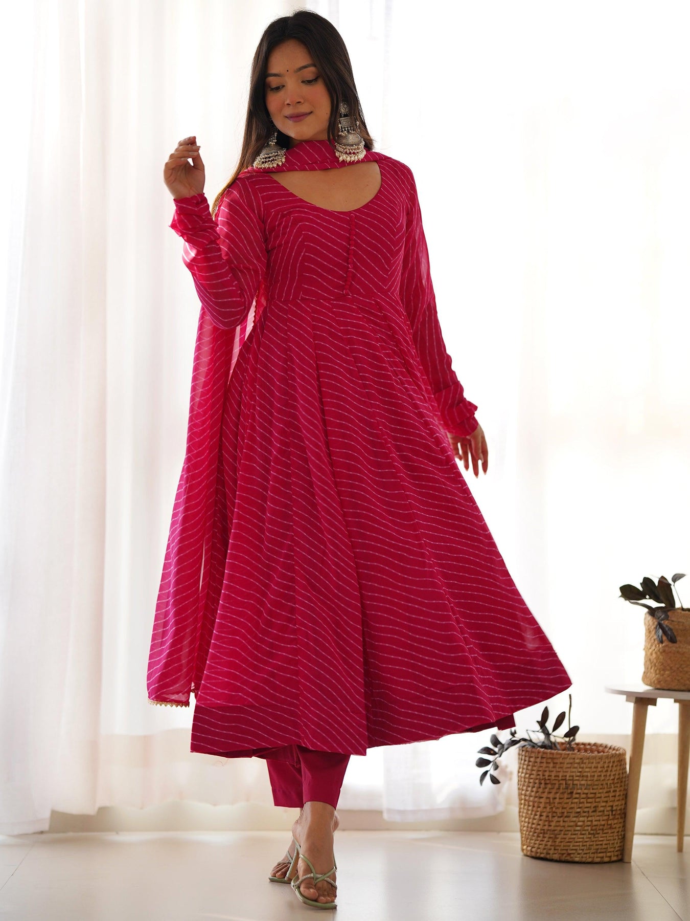 • Introducing our exquisite pink georgette anarkali suit with laheirya print work, a perfect blend of elegance and tradition. This stunning piece features a delicate laheriya print, a traditional tie-dye technique that creates vibrant, wavy patterns.