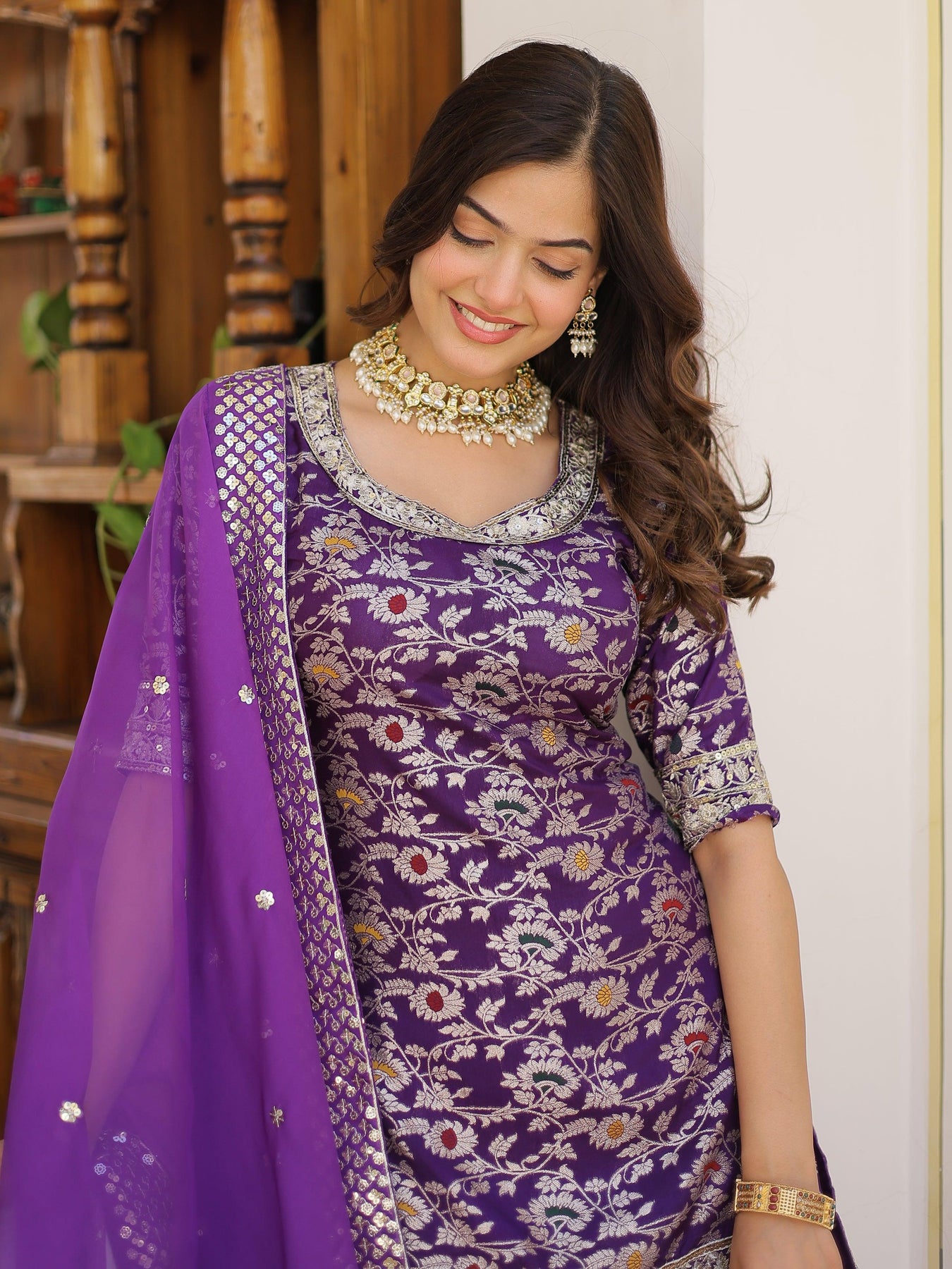 Tantalizing Purple Embroidered Jacquard Wedding Wear Sharara Suit
