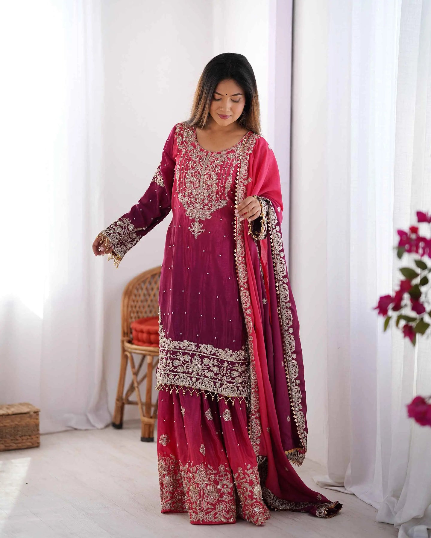 Introducing our latest Sharara Set crafted in luxurious Chinon Silk, adorned with cording dori, sequins, and rivet moti work. Perfect for festivals, weddings, and grand celebrations — where elegance meets tradition.
