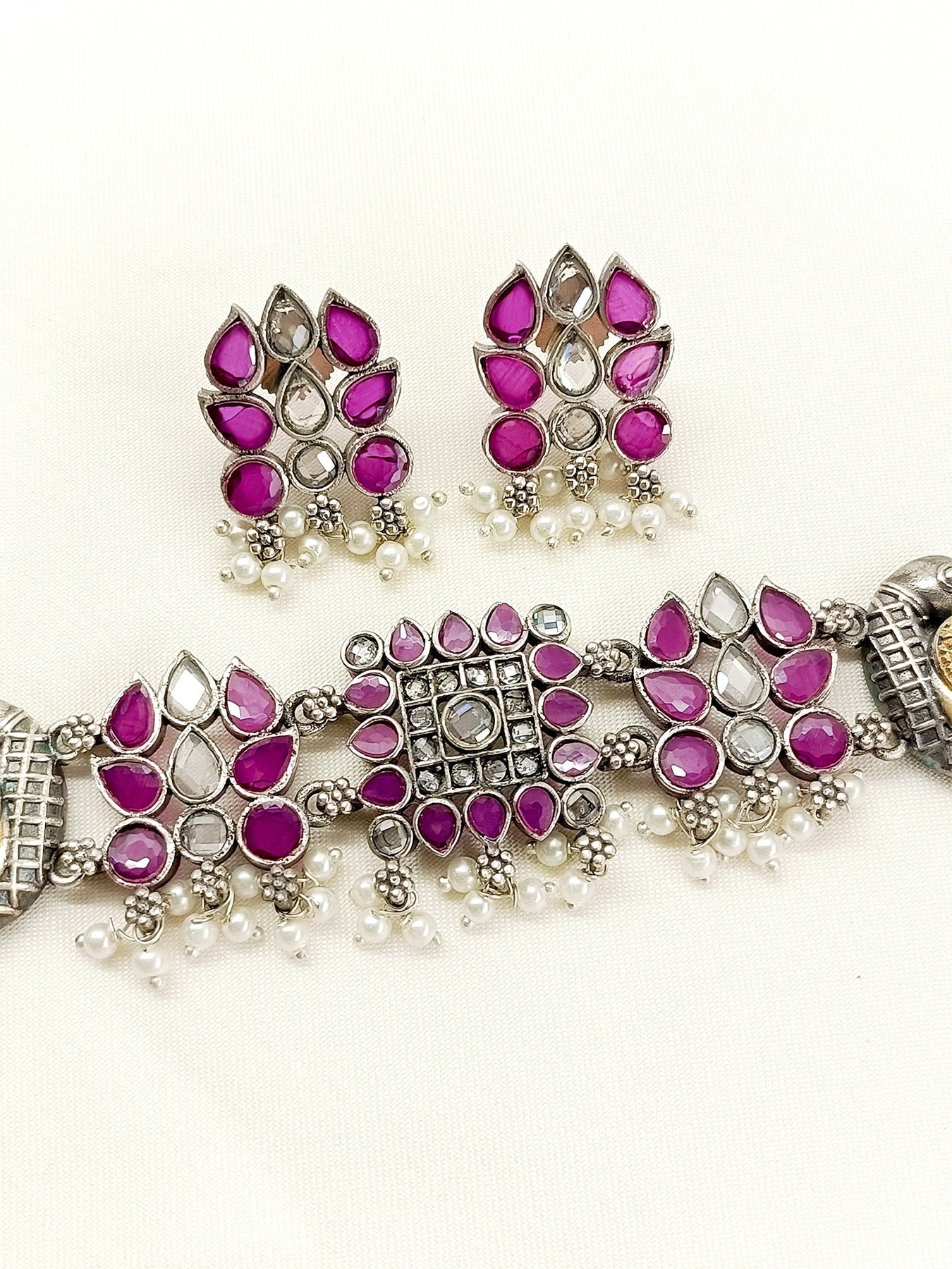 Showcase Your Sense Of Style With This Traditional Oxidized Choker Set. Crafted With Oxidized Silver Plated Brass Metal, You'll Be Sure To Turn Heads With The Intricate Pearl Detailing And Peacock Motifs.