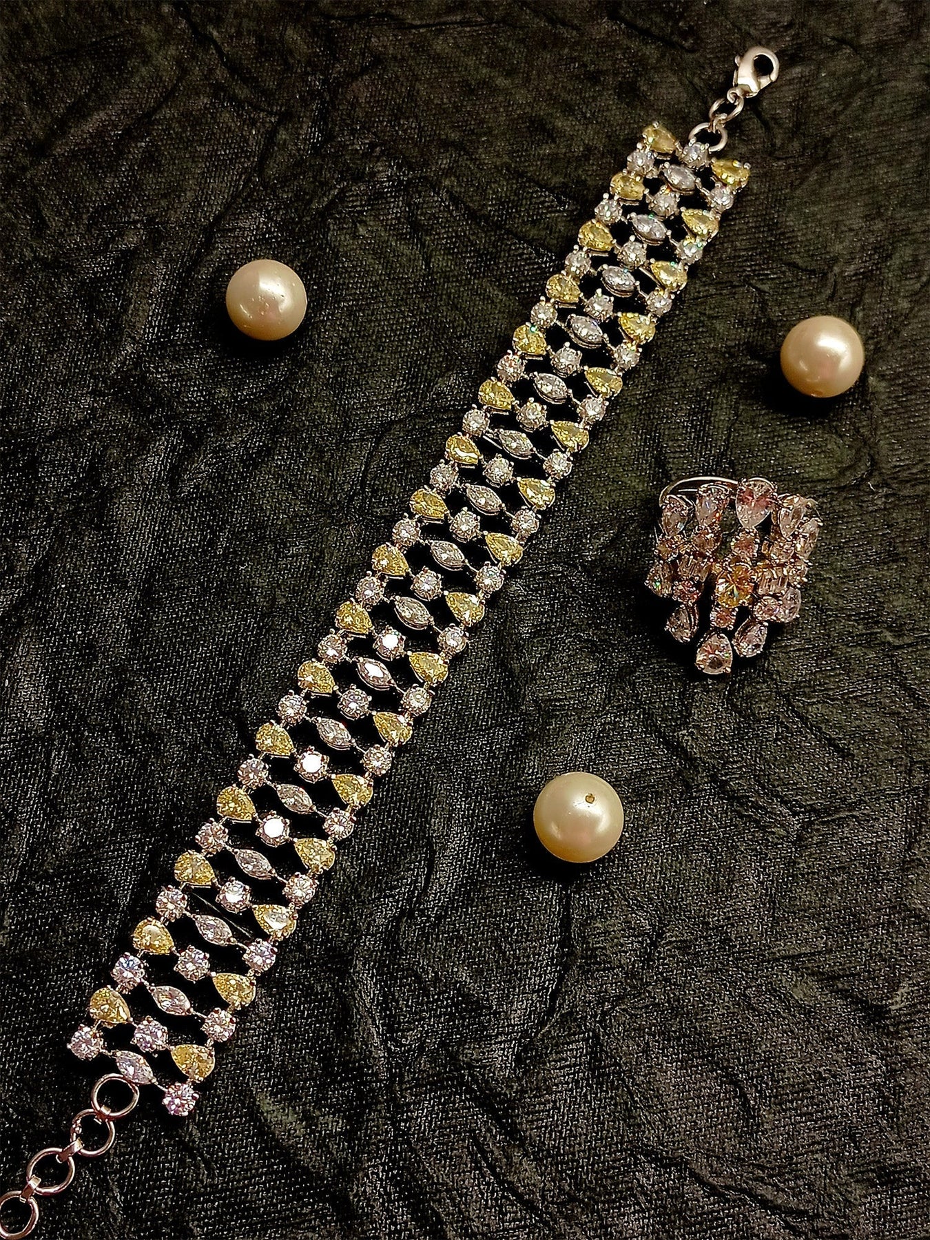 This Charming American Diamond Bracelet With Finger Ring Is Made Of Silver Plated Brass Metal. Its Delicate Design Makes It A Perfect Accessory To Complement Any Look. The American Diamonds Add A Touch Of Sophistication To The Piece.
