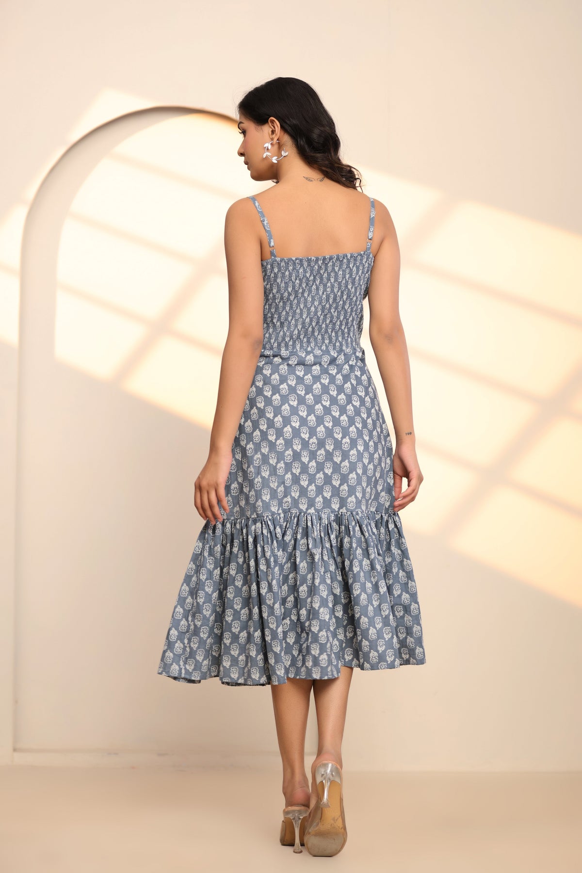 Oyster Grey Cotton Hand Block Printed Midi Dress – A Blend of Timeless Elegance and Soft Aesthetics