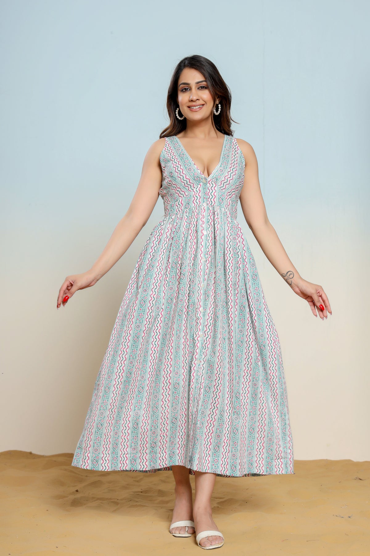 Indulge in the understated elegance of the Whispering Blue Hand Block Printed Cotton Midi Dress, where silent luxury meets soft aesthetics. Made from lightweight, breathable cotton, this handcrafted beauty features delicate floral stripes created through the timeless art of hand-block printing, bringing an artisanal touch to your wardrobe.