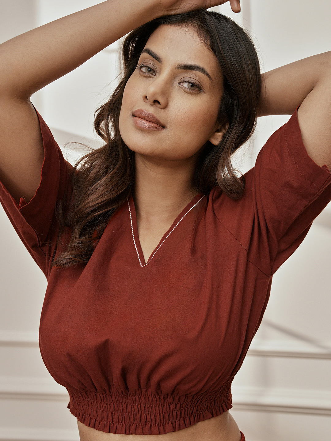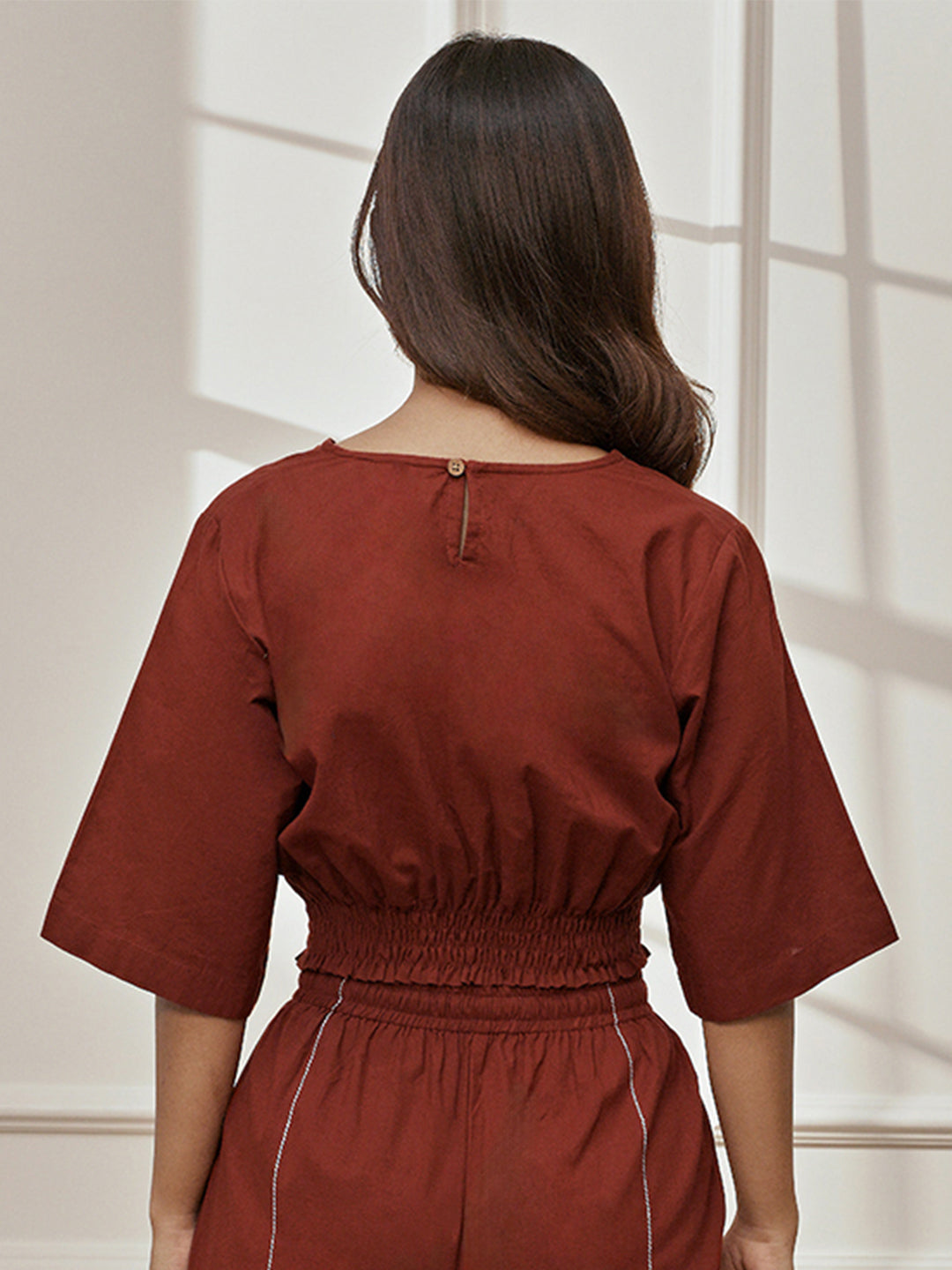 Women's Maroon Cambric Cotton V-Neck Crop Yoga Top