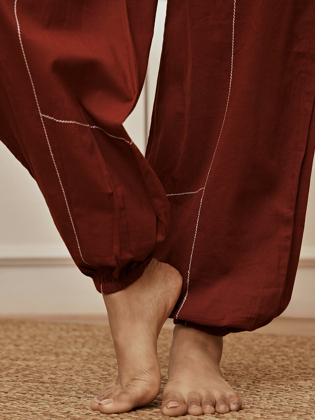 Elevate your yoga wardrobe with these Maroon Joggers from Vastramay. The premium cambric fabric, geometric embroidery details, and comfortable jogger silhouette create the perfect balance of style and functionality for active women.
