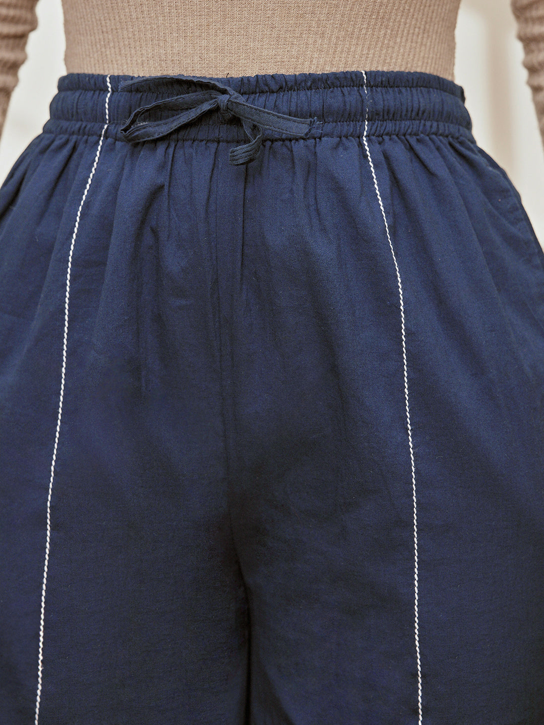 These Navy Blue Joggers from Vastramay combine athletic style with yoga functionality. The premium cambric fabric, geometric embroidery details, and comfortable jogger silhouette offer a contemporary approach to yoga bottom wear.